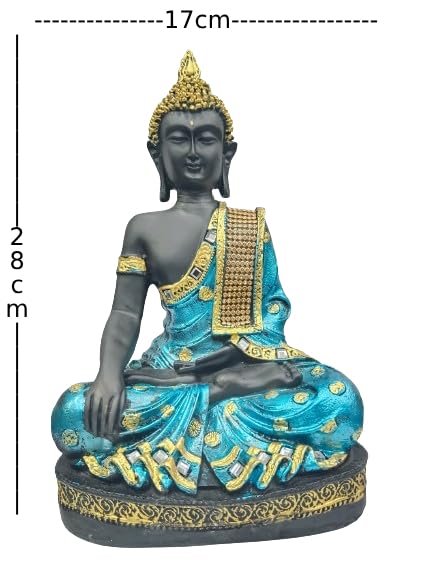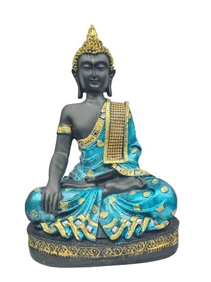 Blue Decorative Ornaments: Adorned with intricate blue decorative accents, adding a touch of elegance and uniqueness to the traditional black Buddha sculpture.